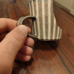 Relativ dünnwanding, leicht konisch nach unten, unten ansetzender Henkel, siehe Foto