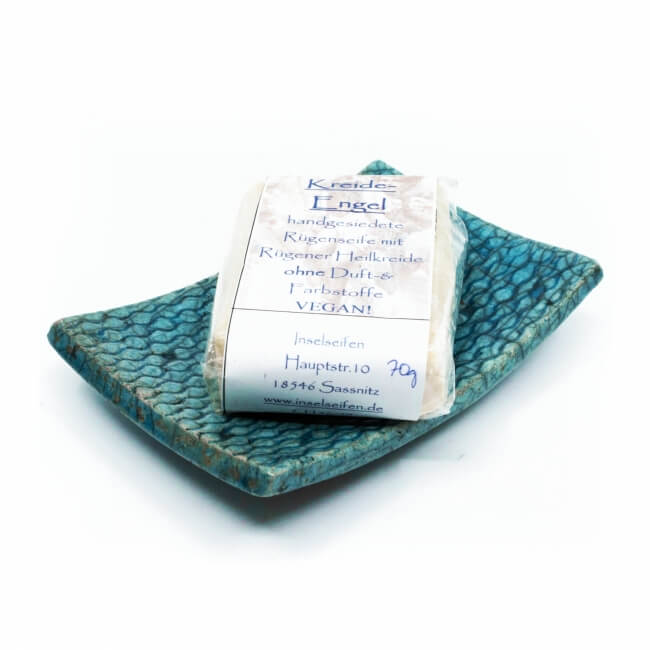 For the enchanting azure blue of the handmade soap dish we have chosen the handmade chalk angel. The 70 g soap bar of the island soap is perfectly suitable for facial care of impure skin and does not contain any fragrance, preservatives or colouring agents. It is refined with the finest healing chalk containing minerals. It is also vegan and the packaging is fully compostable - we like!